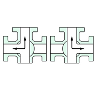 氣動三通球閥分L型和T型,介質流通方向見下圖。L型氣動三通球閥適用于介質流向的切換,能使相互垂直的兩個通道連通:T型氣動三通球閥適用于介質的分流、合流或流向 切換,T型孔道可以使三個通道互相連通或使其中兩個通道連通,氣動三通球閥一般采用三個閥座結構,亦可根據用戶要求采用四閥座結構。